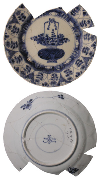 | 5c | decoratie in blauw, spiegel: vaas met bloemstuk; vlag: vakken met bladermotief, bloemen; vlag achterzijde: losse vegetale elementen onderglazuur blauw |