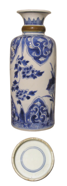 5c decoratie in blauw, banden langs voet en schouder in ruyi-motief, planten, bloemen, bruine band om hals onderglazuur blauw, bruin
