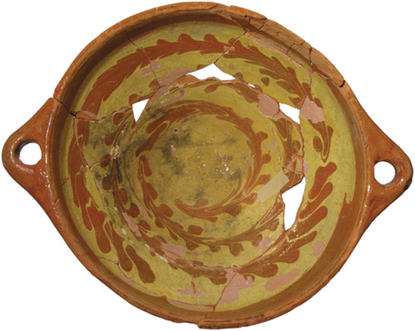 | 5c | witte slibdecoratie, inwendig tot buikknik: gemarmerd; uitwendig op wand ringeloor: golvend vegetaal motief |