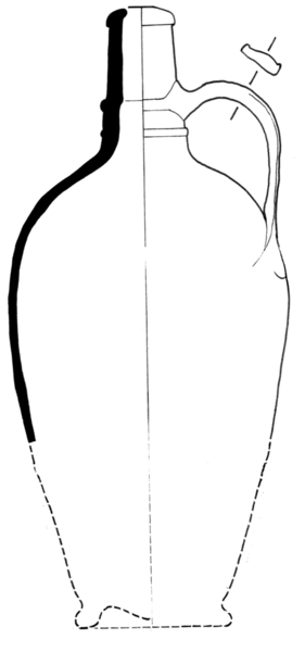 | 4b | P-kruik: iets bolle fles met cilindrische nek en verdikte lip, ribbels op hals, standvoet |