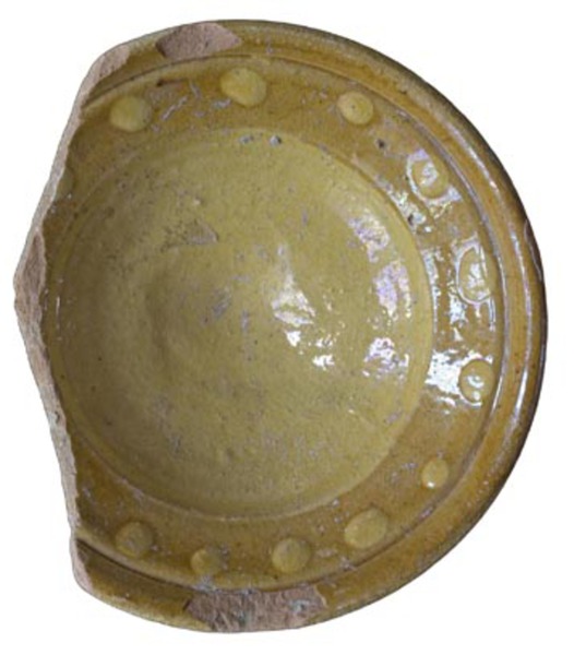 | 5c decoratie | rand: stippels in gele slib, gele spiegel |