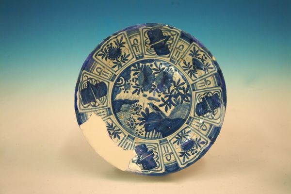 | 5c | vlag: vakken met Chinese symboliek, verbonden met strikken; spiegel: Chinese tuin met vogel op rots; naar kraakproselein. Achterzijde vlag: strepen en stippen blauw |