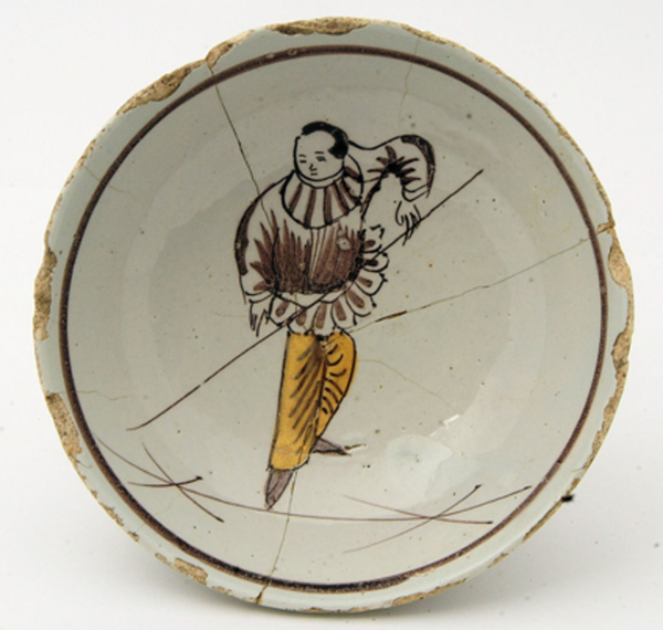 | 5c decoratie | paars en geel op wit: koorddanser binnen cirkel polychroom |