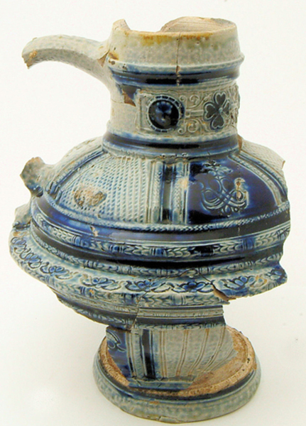 | 5c decoratie | ingevouwen zware ribbel op de buik, stempel- en snijwerk op buik en schouder, medaillon appliques op hals blauw |