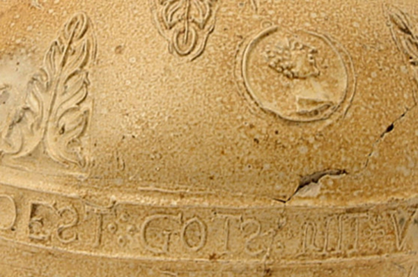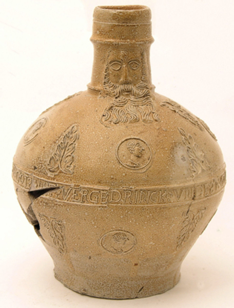 | 5c decoratie | baardman-applique op hals, tekst op buik: DRINCK vND EST GOTS NIT VERGES, op boven- en onderhelft appliques: acanthusbladeren en medaillons met hoofdje baardman |