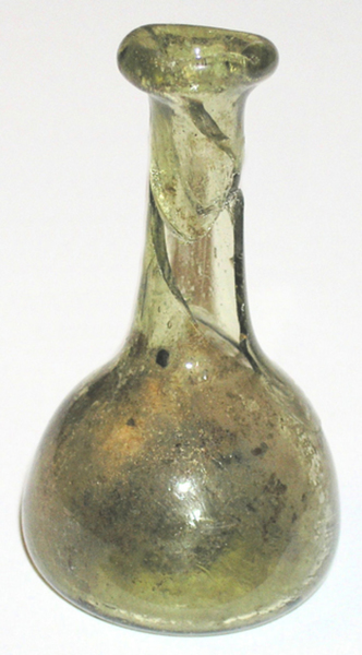 | 4b | kleine halfbolvormige fles met lange hals, opgestoken bodem met pontilmerk |