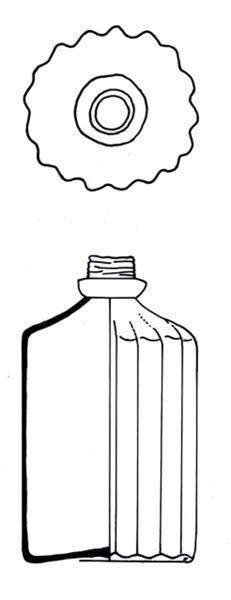 | 4b vorm | kleine cilindrische fles met verticale ribben of cannelures, zonder of met korte hals met uitstaande lip, opgestoken bodem met pontilmerk |