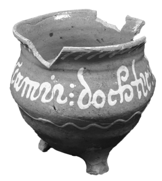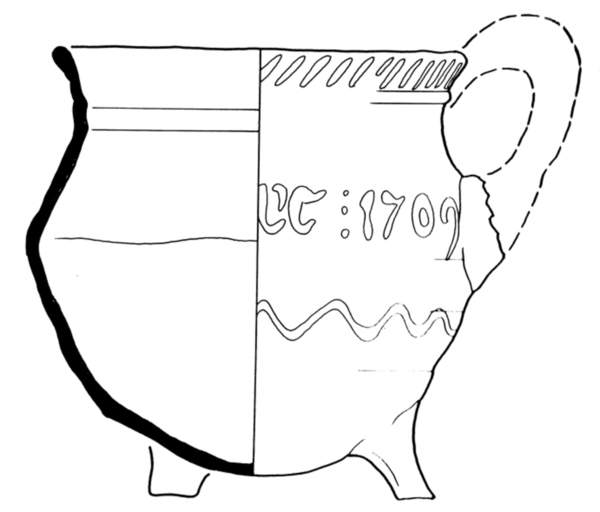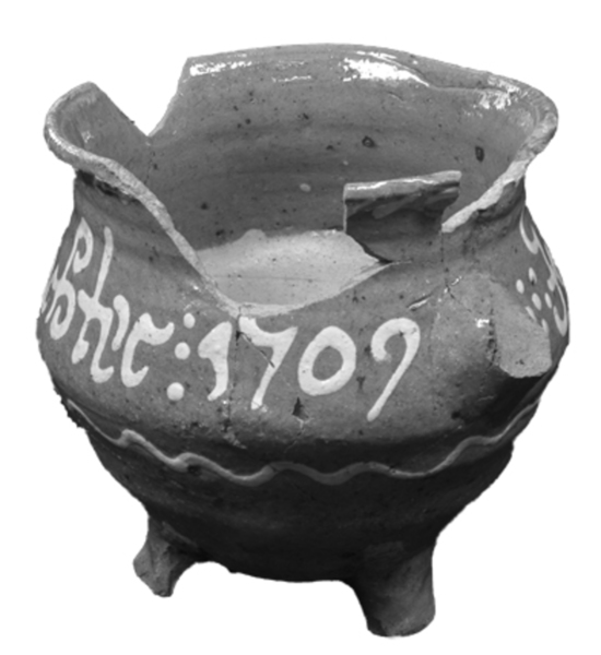 | 5c | inwendig deels gele slib, uitwendig: JANNIETIE TAMIS DOCHTER 1709 in gele slib (ringeloor) met daaronder slingerlijn en daarboven streepjes |
