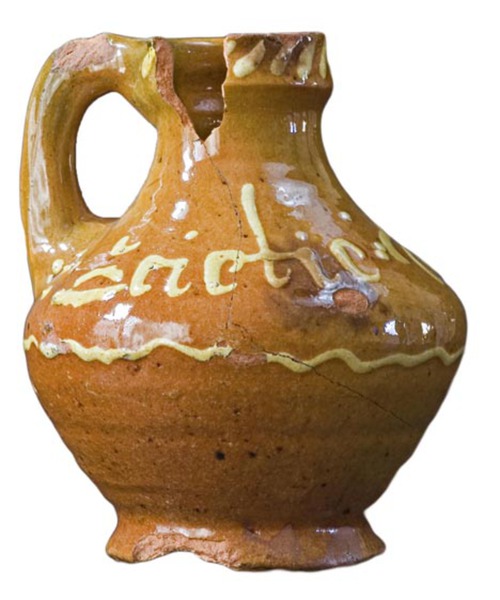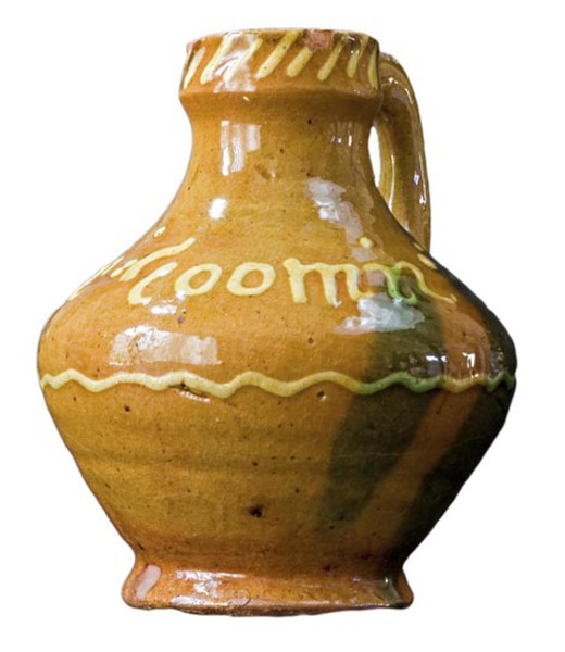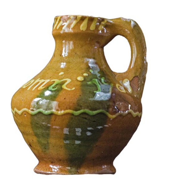 | 5c decoratie | uitwendig in gele slib (ringeloor): GRIETIE TOOMIS 1701 met daaronder slingerlijn en daarboven streepjes; twee koperoxide vlekken |