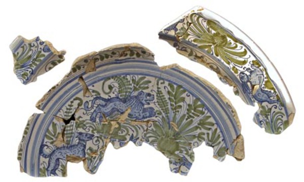 | 5c decoratie | spiegel: twee jachthonden en een katachtig dier in blauw, struiken in groen, vlag: twee hazen in blauw, struiken in groen, overgang spiegel-vlag: blauwe ranken met groene bladeren inwendig: polychroom |