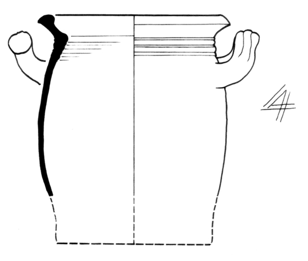 | 4b | hoge tonvormige pot met uitgebogen verdikte en aan de bovenzijde afgeplatte rand, ribbel onder randaanzet, standvlak |