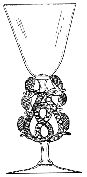 | 4b | trechtervormig kelkglas met of zonder afgeronde bodem, met uit getordeerde draden opgebouwde stam in een dubbele lus, ook met een achtvorm en met vleugels, schijfvormige voet met pontilmerk |