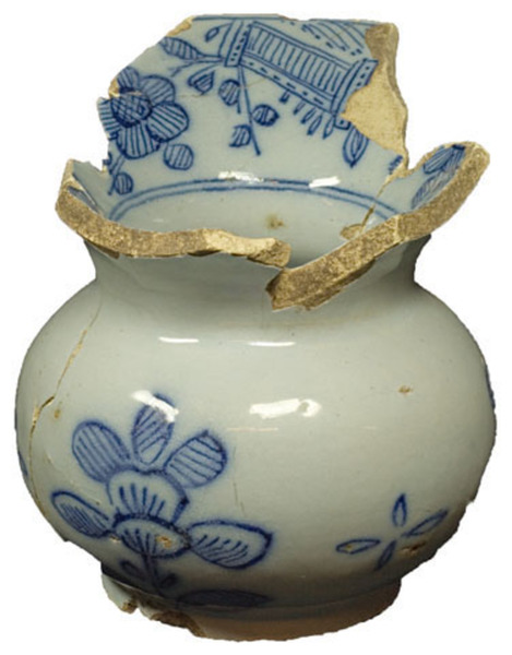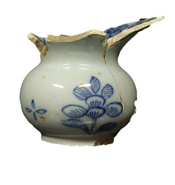 | 5c decoratie | uitwendig: bloemen, trechter inwendig: bloemen, alles in blauw blauw |