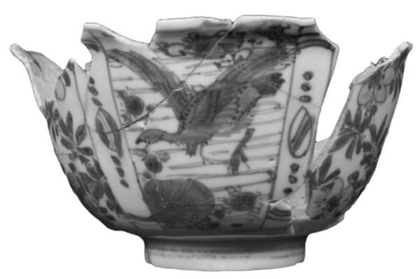 | 5c | uitwendig een beschildering van landschappen in de grote segmenten en Chinese motieven op de ribben, alles in blauw uitwendig: onderglazuur blauw |