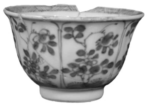 | 5c decoratie | uitwendig florale motieven, inwendig cirkel met bloem in blauw onderglazuur blauw |