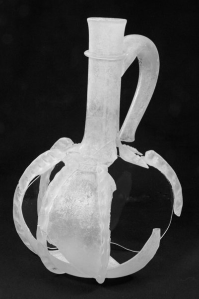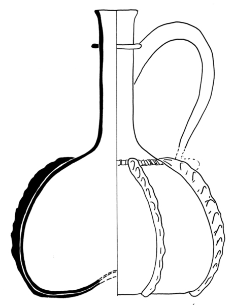 | 4b | bolvormige fles met lange hals en met oor, met draad ruim onder de lip, met opgelegde zware verticale ribben, opgestoken bodem met pontilmerk |