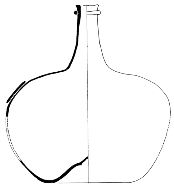| 4b | bolvormige wijnfles met lange hals, ook met oor, met grootste breedte aan de schouder, met draad ruim onder de lip, opgestoken bodem met pontilmerk |