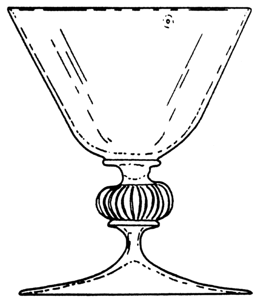 | 4b vorm | cilindrisch, trechtervormig of komvormig kelkglas met of zonder afgeronde bodem (ook met verticaal ribbenpatroon) met geribde holle nodus- of balusterstam, met één of meer schijfjes, schijfvormige voet met pontilmerk |