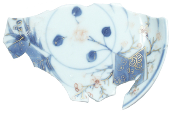 | 5c | onderglazuur blauw, bovenglazuur goud en rood; inw: blad en bloemmotief in blauw, rood en goud; uitw: tekens polychroom |