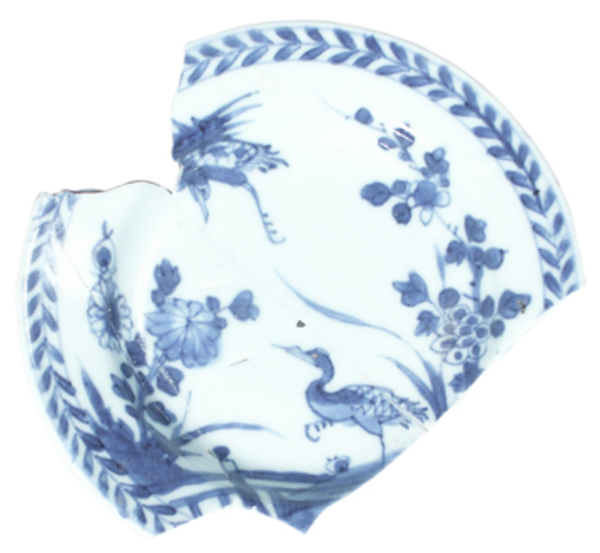 | 5c | rand: lauwerkrans; vlag en spiegel: vogel in landschap met bloemen onderglazuur blauw |