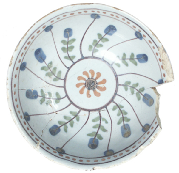 | 5c | kobaltblauw, koperoxide en ijzeroxide; inw: wentelend rad motief van stengels en stengels met blad polychroom |