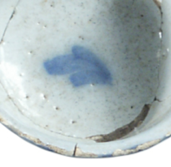 | 5c decoratie | uitw: onder rand boogjes in blauwe band en granaatappels in ovalen, inw: pijl op spiegel blauw |