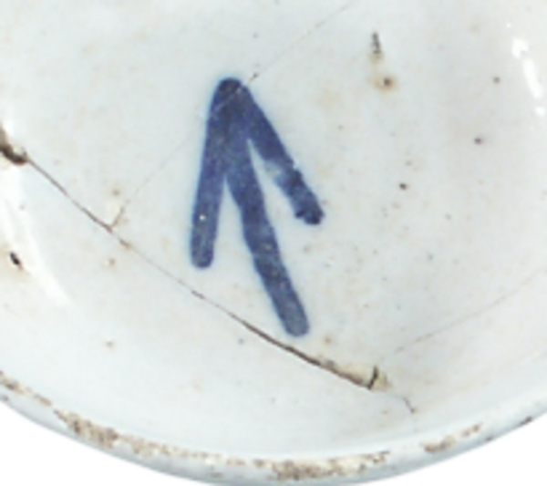 | 5c | inw: pijl op spiegel; uitw: twee horizontale banen van stilistische bloemen in hokjes blauw |