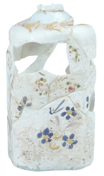 | 4b | achtzijdige likeurfles met korte hals en uitstaande lip, ook met emailbeschildering, standvlak of licht opgestoken bodem met pontilmerk |
