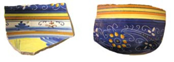 | 5c | (blauw, geel en oker), buitenzijde: deels ingekrast en deels geschilderd bloemdecor polychroom |