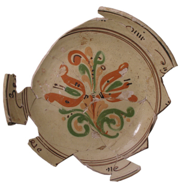 | 5c | ringeloor decoratie (in kopergroen, ijzerrood, mangaanpaars en okergeel): op spiegel floraal motief, op vlag tekst (onbekend) inwendig: polychroom |