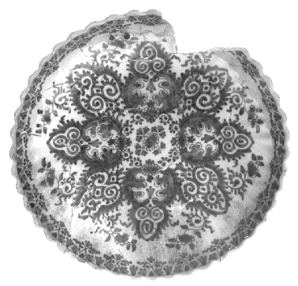| 5c decoratie | inwendig: blauw op wit; beschilderd met gestileerde bloemen blauw |