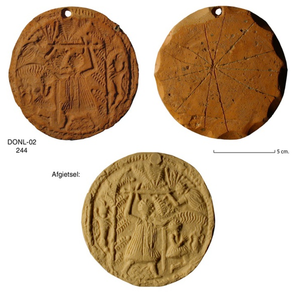 | 5c decoratie | voorzijde: negatief uitgevoerde bijbelse voorstelling 'Abraham offert zijn zoon Isaac', achterzijde ingekraste lijnen |