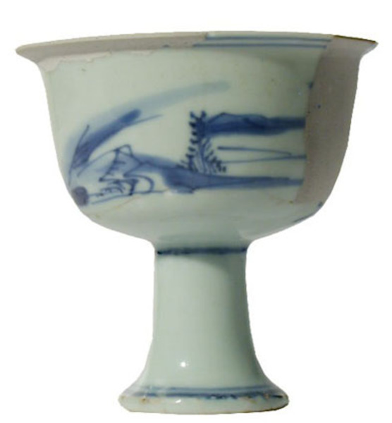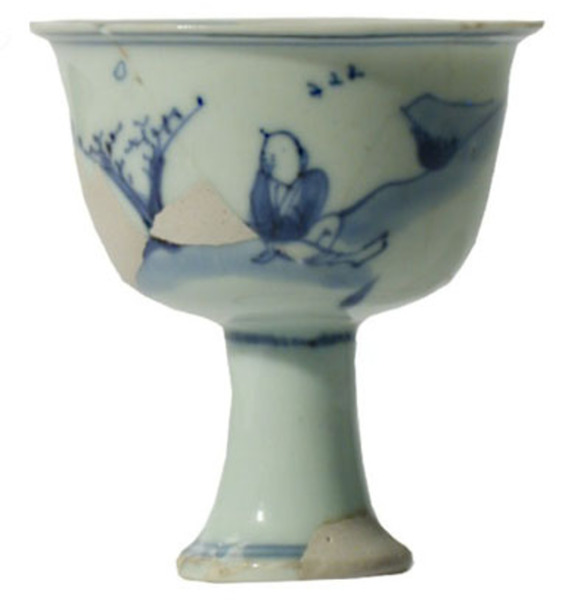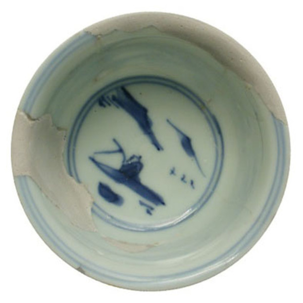 | 5c | uitwendig: in landschap zittende Chinees, inwendig: idem, beide decors sterk gestileerd onderglazuur blauw |
