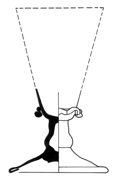 | 4b vorm | conisch kelkglas, aan onderzijde kelk gegolfde draad, holle balusterstam, schijfvormige voet met pontilmerk |