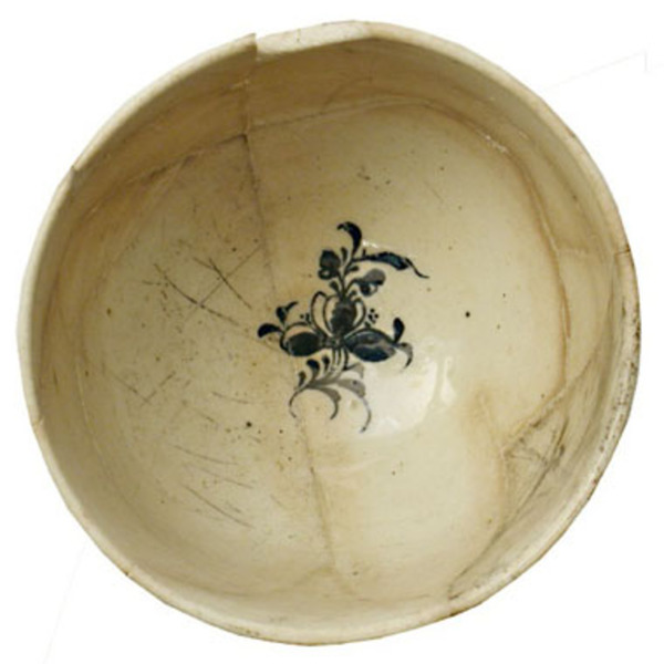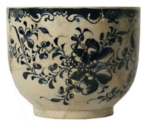 | 5c decoratie | transfer-print, uitwendig: bloemen - ranken; inwendig op bodem: bloem verkleurd in bodem blauw |