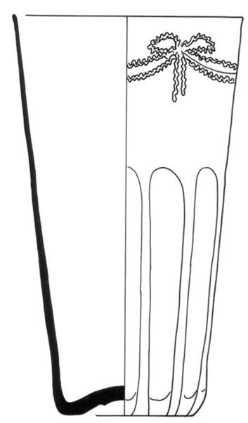 | 4b vorm | dikwandige beker met vormgeblazen reliëf met verticale ribben, onderaan achtzijdig verdikte bodem met standvlak met (eventueel weggeslepen) pontilmerk |
