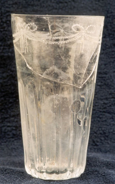 | 4b | dikwandige beker met vormgeblazen reliëf met verticale ribben, onderaan achtzijdig verdikte bodem met standvlak met (eventueel weggeslepen) pontilmerk |