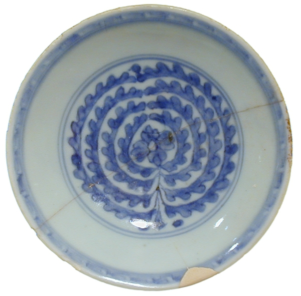 | 5c | bovenzijde: bloem omgeven door 4 bladerkransen onderzijde: bamboe onderglazuur blauw |