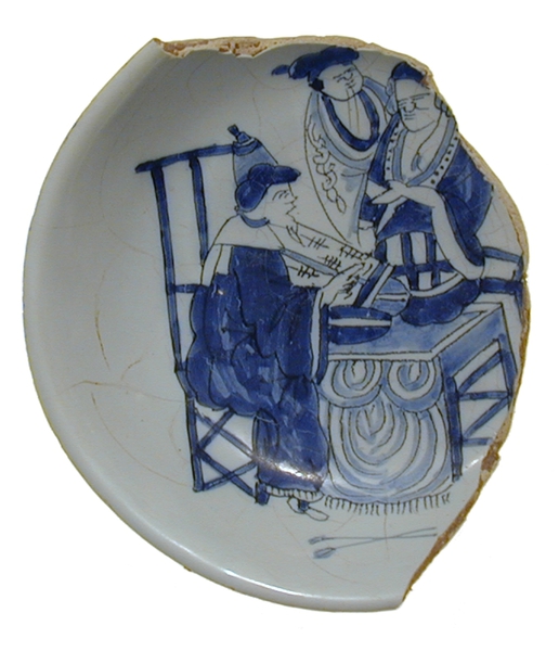 | 5c decoratie | bovenzijde: drie Chinese wijzen rond een tafel inwendig: blauw |