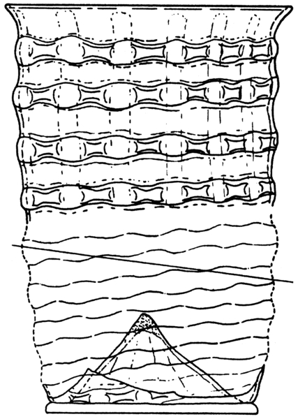 | 4b | cilindrische of licht conische beker met wafelpatroon, uitstaande lip, opgestoken bodem met pontilmerk, voetring |
