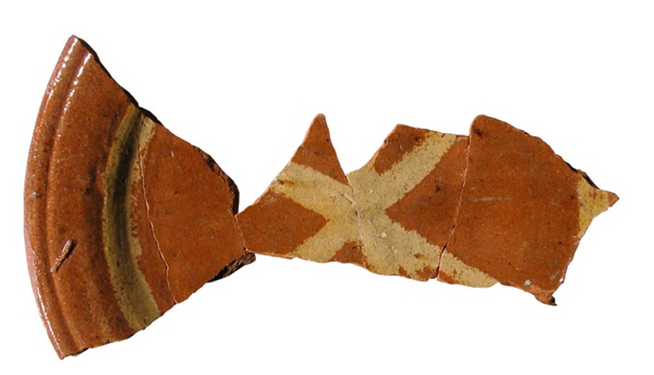 | 5c decoratie | eenvoudig in slib opgekwast decor van drie gekruiste banen binnen cirkel |