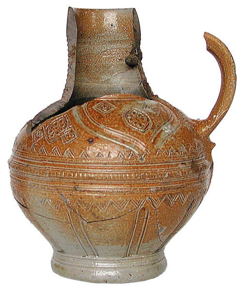 | 4b vorm | kan met kogelronde buik en cilindrische hals met bundels ribbels op de hals, uiteenlopende decoraties, soms tweedeling van de buik, standvoet |