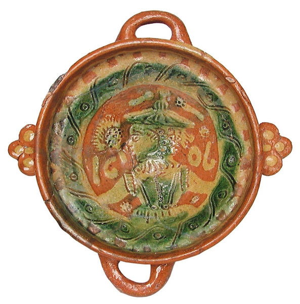 | 5c decoratie | inwendig sliblaag, spiegel: in ringeloor en sgrafitto uitgevoerde afbeelding van man met strooien hoed en jaartal 1606 |