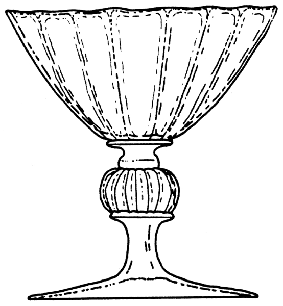 | 4b | trechtervormig of cilindrisch kelkglas met of zonder afgeronde bodem, met verticale ribben of netwerkversiering in reliëf, stam met geribde nodus, schijfvormige voet met pontilmerk |