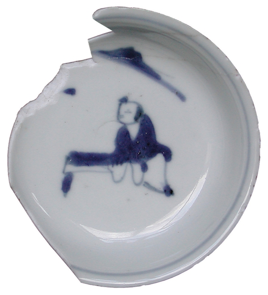 | 5c | spiegel: Chinees op bank, vlag: concentrische cirkel onderglazuur blauw |
