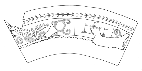 | 5c | gegraveerde band met blad- en zonnebloempatroon, geometrische figuren en Chinees kasteel met pagodes |