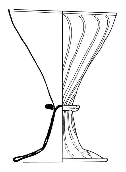 | 4b | voetbeker met trechtervormige wand, iets naar binnen gebogen voetbeker met verticale ribben-, ruit- of netwerkpatroon in reliëf of een combinatie daarvan, ook met aanhangende ringen, ook draad rond taille, opgestoken hoge ingevouwen voet met pontilmerk |