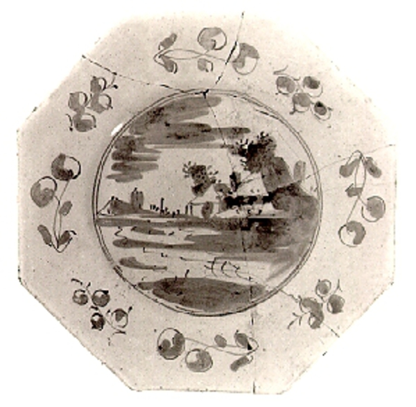 | 5c decoratie | inwendig: blauw op wit; paarse trek; vlag: gestileerde bloemen; spiegel: landschap blauw en paars |