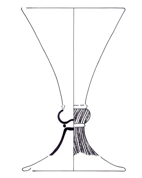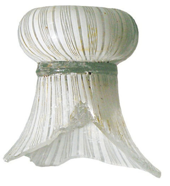| 4b | trechtervormige bokaal met bolvormige stam met 'Vetro a fili e retorti', hoge voet met omgeslagen voetrand, pontilmerk |