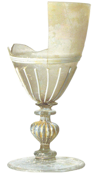 | 4b | diep paraboolvormig kelkglas met of zonder versiering op de kelk, met holle geribde balusterstam tussen dikke schijven, schijfvormige voet met pontilmerk |